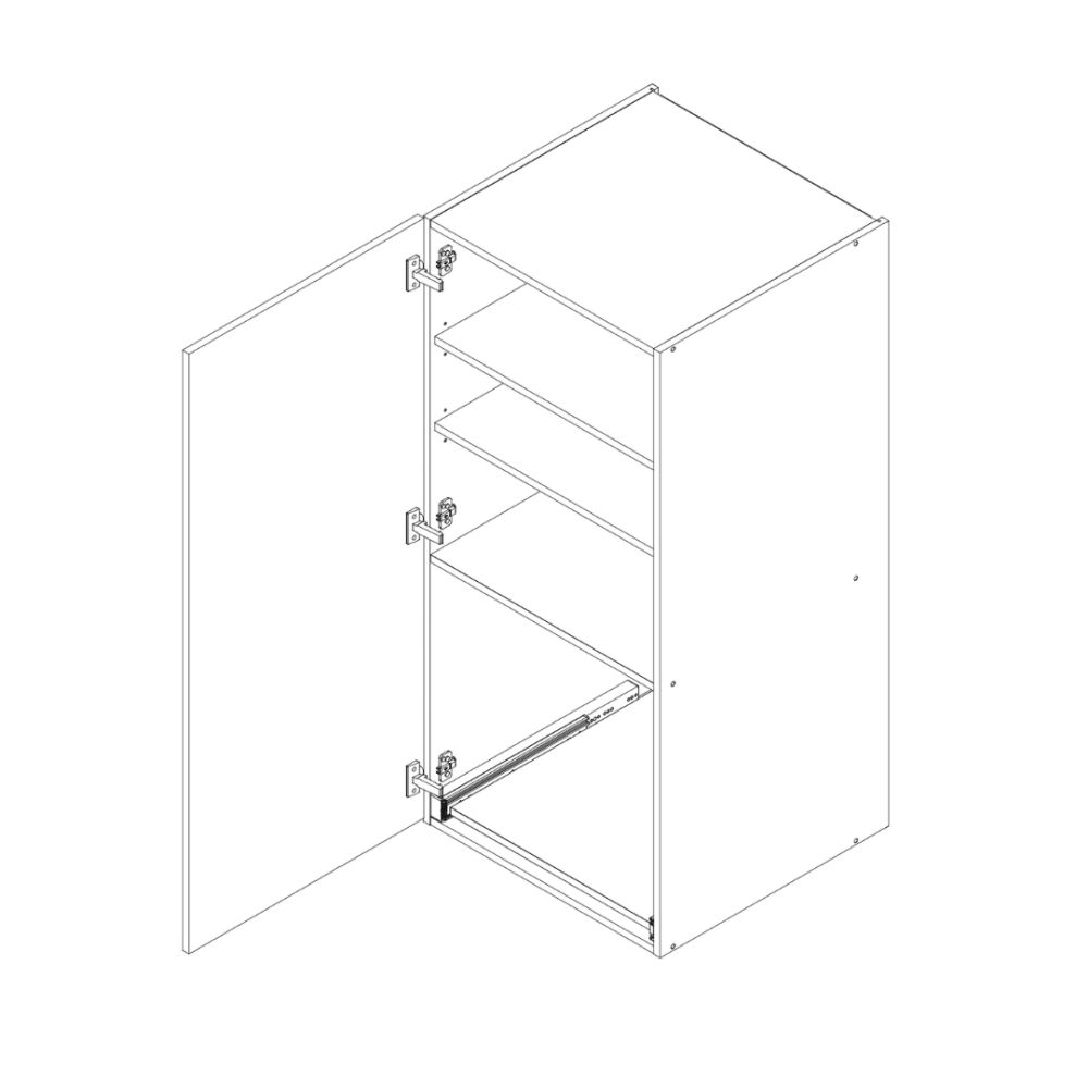 Szerokość w szafkach z 1 frontem (P/L) – zakres 250mm – 650mm, zmiana o 10mm.