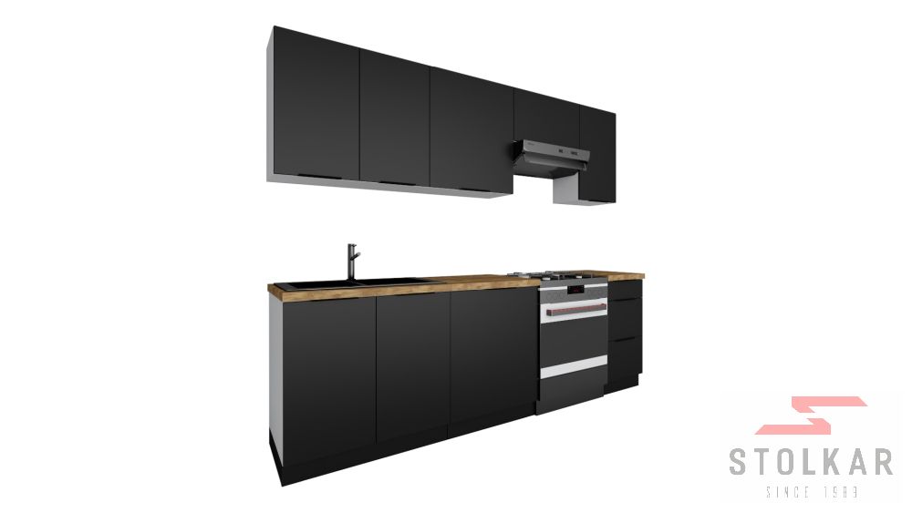 Front i korpus z płyty laminowanej o grubości 16 mm. Cokół w zestawie z szafką, podstawowe akcesoria montażowe w komplecie, blat do wyboru w opcjach dodatkowych.